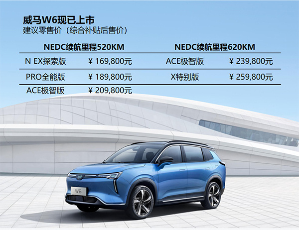 2021年5月2日,第三十七屆福州國際汽車博覽會第二天開幕大廳主舞臺,“智敬每個你”威馬W6福州區(qū)域上市發(fā)布會上,福州威馬用戶中心總經(jīng)理、體驗總監(jiān)與媒體代表一起,共同見證了,擁有“最實用無人駕駛”、“最好玩場景編程”、“最靈敏語音交互”的全新車型威馬W6重磅上市,新車共推出5款車型,售價區(qū)間為16.98-25.98萬元,并進(jìn)行首位車主交付。 作為造車新勢力上半年唯一交付的全新車型,威馬W6率先搭載高通8155芯片、率先達(dá)到L4級別無人駕駛、率先實現(xiàn)SOA技術(shù)應(yīng)用。 “宇航科技”設(shè)計理念 威馬W6全車尺寸為4620/1847/1730mm,軸距達(dá)到2715mm,搭載160kW永磁同步電機(jī),NEDC續(xù)航里程最高可達(dá)620km。整車外觀采用“宇航科技”造型設(shè)計理念,由航天飛船圓潤飽滿的造型汲取設(shè)計靈感,塑造出符合時代審美方向的極簡風(fēng)格。M型一體式貫穿燈組延續(xù)了家族式設(shè)計語言,“機(jī)翼式特征線造型設(shè)計”在車頭與車尾之間構(gòu)成呼應(yīng)。潤圓曲面車身結(jié)合隱藏式門把手,實現(xiàn)了0.3cd的超低風(fēng)阻系數(shù)。懸浮式車頂與“太空船式尾翼”設(shè)計彰顯了經(jīng)典運動SUV的大氣比例。 色彩方面,威馬W6通過超級計算機(jī)仿真模擬,從1,600萬種顏色中臻選無畏綠、探索藍(lán)、競速橙、晨曦綠、星際黑、電磁紅、靈感白、無極灰,共8種前衛(wèi)色彩作為品牌煥新的全新色彩體系。