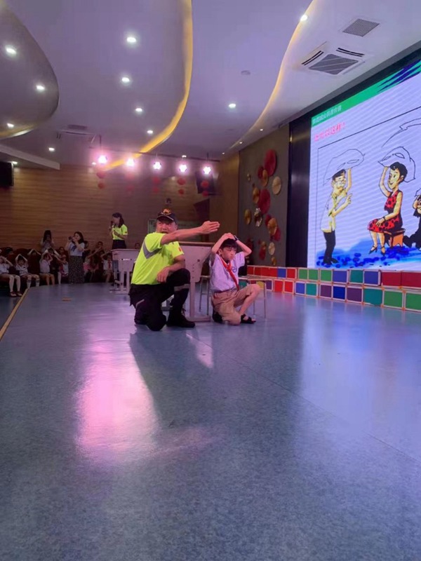 活動(dòng)在表演中拉開帷幕。學(xué)校供圖 本次活動(dòng)在一段精彩的開場(chǎng)表演中拉開帷幕。在場(chǎng)師生一起觀看了一段防災(zāi)減災(zāi)的宣傳片。麒麟防災(zāi)減災(zāi)救援服務(wù)中心的叔叔阿姨們給大家?guī)矸罏?zāi)減災(zāi)情景表演,他們認(rèn)真講解、演示遇到地震時(shí)應(yīng)如何躲避風(fēng)險(xiǎn),并在現(xiàn)場(chǎng)指引孩子們遇到危險(xiǎn)時(shí)如何逃生、如何保護(hù)自己。