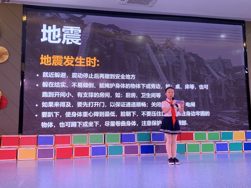 躲避地震知識(shí)講解。學(xué)校供圖 江南水都小學(xué)的三名小小宣講員們?yōu)橥瑢W(xué)們帶了生動(dòng)的防災(zāi)減災(zāi)知識(shí)宣講。而有獎(jiǎng)安全知識(shí)問答則將活動(dòng)再次帶向高潮。本次活動(dòng)在集體朗誦表演中圓滿結(jié)束。本次活動(dòng)給孩子們帶來了很多防災(zāi)減災(zāi)的知識(shí),樹立了良好的安全意識(shí),增強(qiáng)了廣大師生在災(zāi)害中的逃生自救、應(yīng)對(duì)緊急突發(fā)事件的能力,進(jìn)一步推進(jìn)了平安校園的建設(shè)。