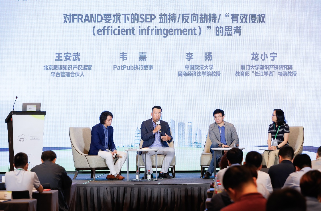 第一場圓桌討論的主題是“FRAND要求下的SEP劫持/反劫持/有效侵權(efficient infringement)的思考”,由思韜專利運營平臺的王安武先生擔任主持。圓桌討論期間,PatPub的韋嘉先生、中國政法大學的李揚教授和廈門大學的龍小寧教授分別就FRAND要求在標準必要專利許可中的具體內涵、有效侵權的產(chǎn)生原因、SEP劫持和反劫持的含義、現(xiàn)狀和解決方案等熱點問題進行了熱烈討論。