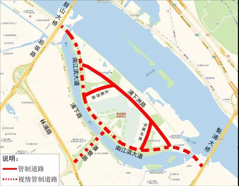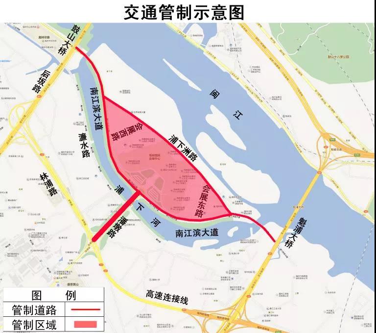 二、2021年6月18日12:00至18:00和2021年6月19日至20日每日7:00至18:00,對(duì)浦下洲路、會(huì)展東路、會(huì)展西路實(shí)行交通管制,禁止車輛(除持專用通行證車輛、公交車、出租車外)通行,南江濱大道(魁浦大橋下至鼓山大橋下)禁止所有車輛(含公交車和出租車)停靠。