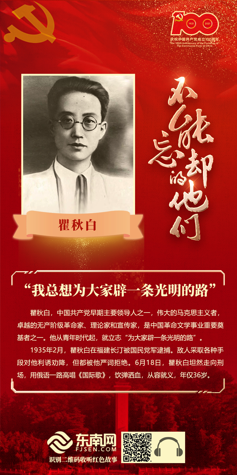東南網(wǎng)6月18日訊(本網(wǎng)記者 林雯晶) 今年是中國共產(chǎn)黨成立100周年,作為中央蘇區(qū)和革命老區(qū),福建在黨史上留下極為鮮明的印記,出現(xiàn)了一大批影響深刻的革命先烈。其中,有在閩犧牲的無產(chǎn)階級革命家,有全國工農(nóng)群眾運(yùn)動的先驅(qū),有戰(zhàn)斗在抗敵第一線的先鋒斗士,有致力于蘇維埃政權(quán)建設(shè)的紅色楷?!?/p> 天地英雄氣,千秋尚凜然。東南網(wǎng)聚焦在閩犧牲或福建籍革命先烈,特別策劃推出“不能忘卻的他們”系列融媒體產(chǎn)品。產(chǎn)品采用全新的形式,每期均由人物稿件和有聲海報組成,網(wǎng)友可以邊看邊聽,讓革命先烈故事“聲”入人心,從先輩身上汲取源源不斷的奮進(jìn)力量。 86年前的今天,中國共產(chǎn)黨早期主要領(lǐng)導(dǎo)人之一、偉大的馬克思主義者、卓越的無產(chǎn)階級革命家瞿秋白在龍巖長汀慷慨就義。在這個特別的日子,東南網(wǎng)推出本系列第一期《瞿秋白:“為大家辟一條光明的路”》,共同緬懷這位卓越的無產(chǎn)階級革命家,重溫瞿秋白同志“生如夏花之絢爛,死如秋葉之靜美”的一生。 紀(jì)念是為了更好地前行,“不能忘卻的他們”系列產(chǎn)品還將陸續(xù)推出林祥謙、何叔衡、吳石、蔡威等革命先輩的紅色故事,與網(wǎng)友一道致敬歷史,傳承紅色基因,為實(shí)現(xiàn)中華民族偉大復(fù)興中國夢而不懈努力!