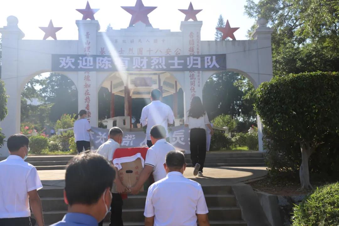 8時20分,載有陳有財烈士遺骸的殯儀車隊從西埔鎮(zhèn)雙東村出發(fā)后,直接駛?cè)霒|山戰(zhàn)斗烈士陵園。當?shù)亟痪疽才跑囕v護送,沿途群眾迎接,考慮到疫情防控嚴峻形勢,此次遷移本著簡樸但不失莊重原則,盡量減少參加活動人員、盡量壓縮儀式的內(nèi)容。但殯儀車兩側(cè)“英雄歸隊 浩氣長存”條幅還是吸引了不少沿途群眾,他們紛紛停下腳步、駐足致敬,目送烈士走過的每一秒鐘。 “歡迎陳有財烈士歸隊”。在同烈士曾經(jīng)并肩作戰(zhàn)的公安八十團“家”門口,苦苦等了68年的448名“戰(zhàn)友”,今天終于全部團聚了。安放烈士遺骸、向烈士英靈鞠躬、向烈士敬獻鮮花,簡短而又莊重的儀式在烈日的照耀下顯得更加熠熠生輝,烈士靈龕上的國旗正像是無數(shù)烈士的鮮血,紅色且是熱的。在充分尊重烈屬意愿、尊重地方習俗和注重人文關(guān)懷的基礎(chǔ)上,烈屬選擇了今天的好日子讓他們團聚,充分體現(xiàn)了他們對烈士的尊重及對祖國的感恩。