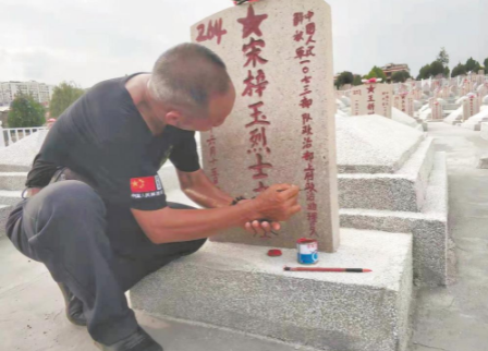 “守墓人”葉子華為烈士墓碑描紅。 本報記者 何祖謀 攝