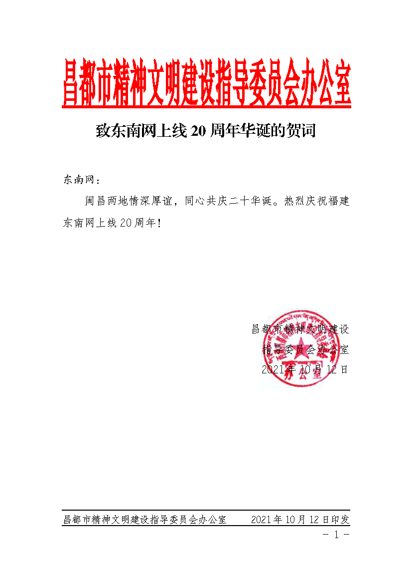 昌都市精神文明建設(shè)指導(dǎo)委員會(huì)辦公室賀信