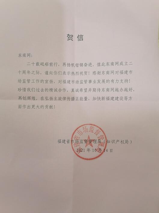 福建省市場監(jiān)督管理局(知識產(chǎn)權(quán)局)賀信