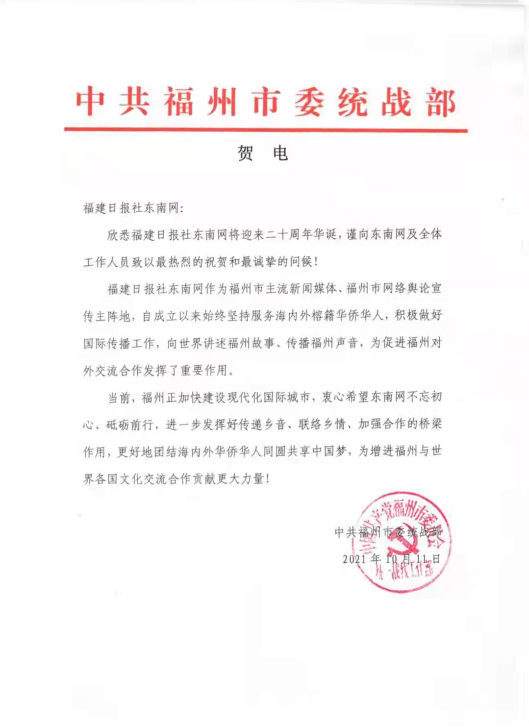 中共福州市委統(tǒng)戰(zhàn)部賀信