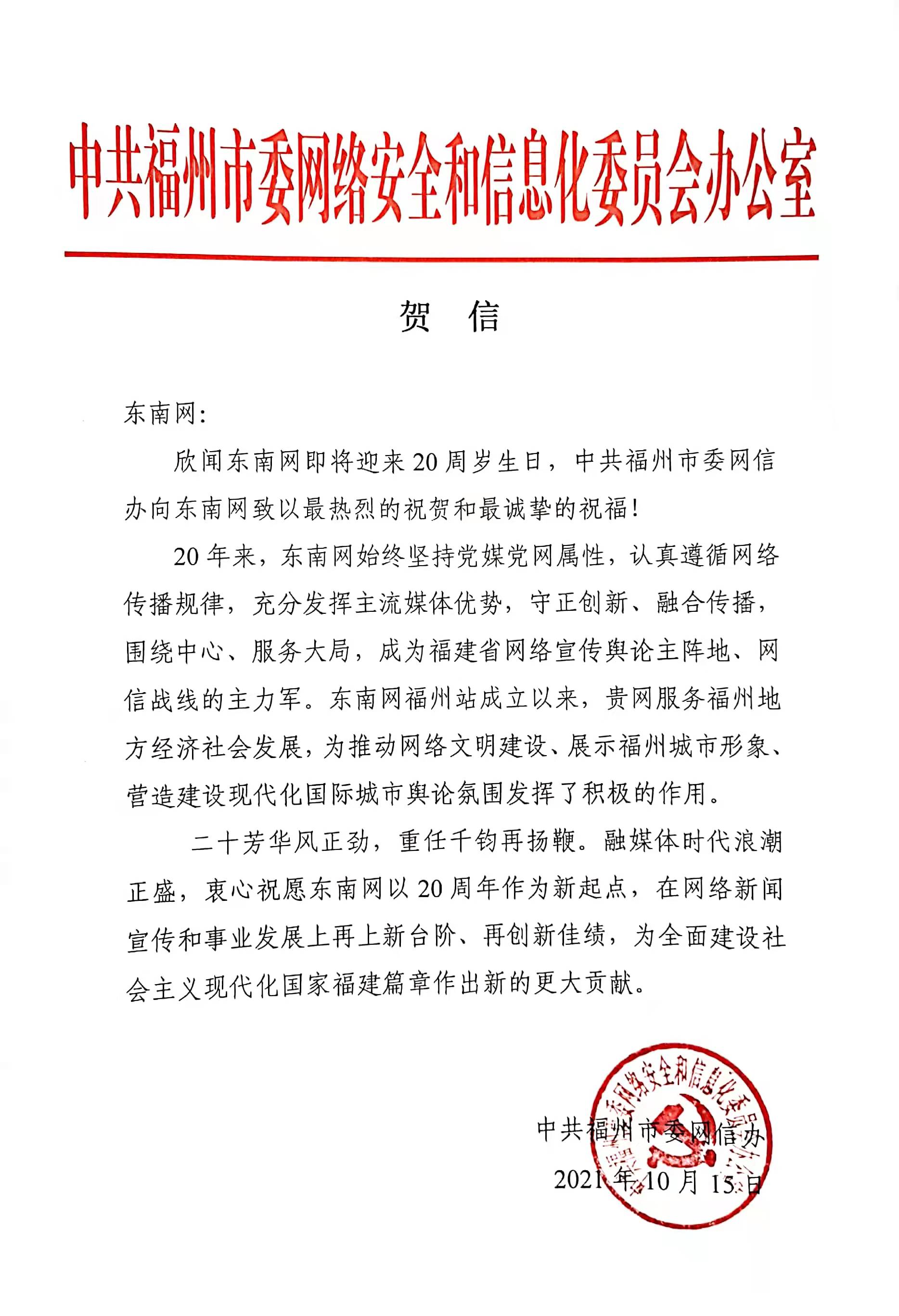 中共福州市委網(wǎng)絡(luò)安全和信息化委員會辦公室賀信