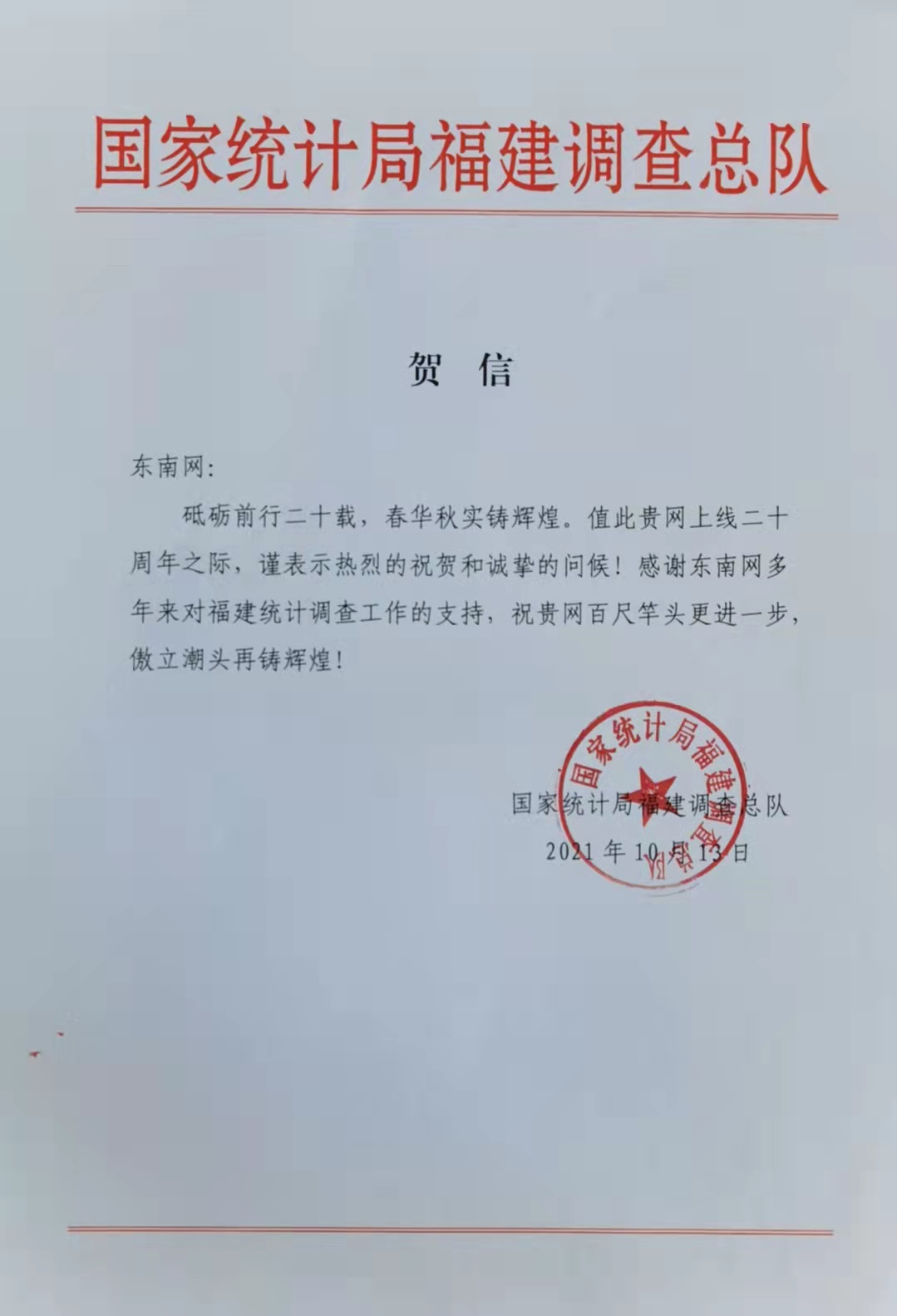 國家統(tǒng)計局福建調查總隊賀信