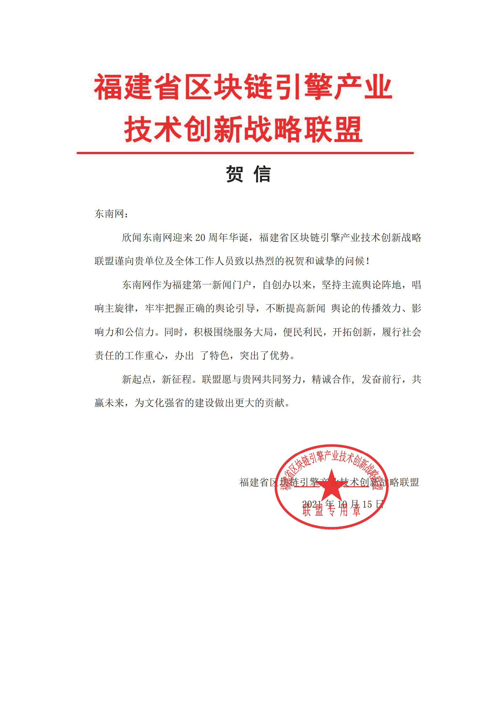 福建省區(qū)塊鏈引擎產(chǎn)業(yè)技術(shù)創(chuàng)新戰(zhàn)略聯(lián)盟賀信