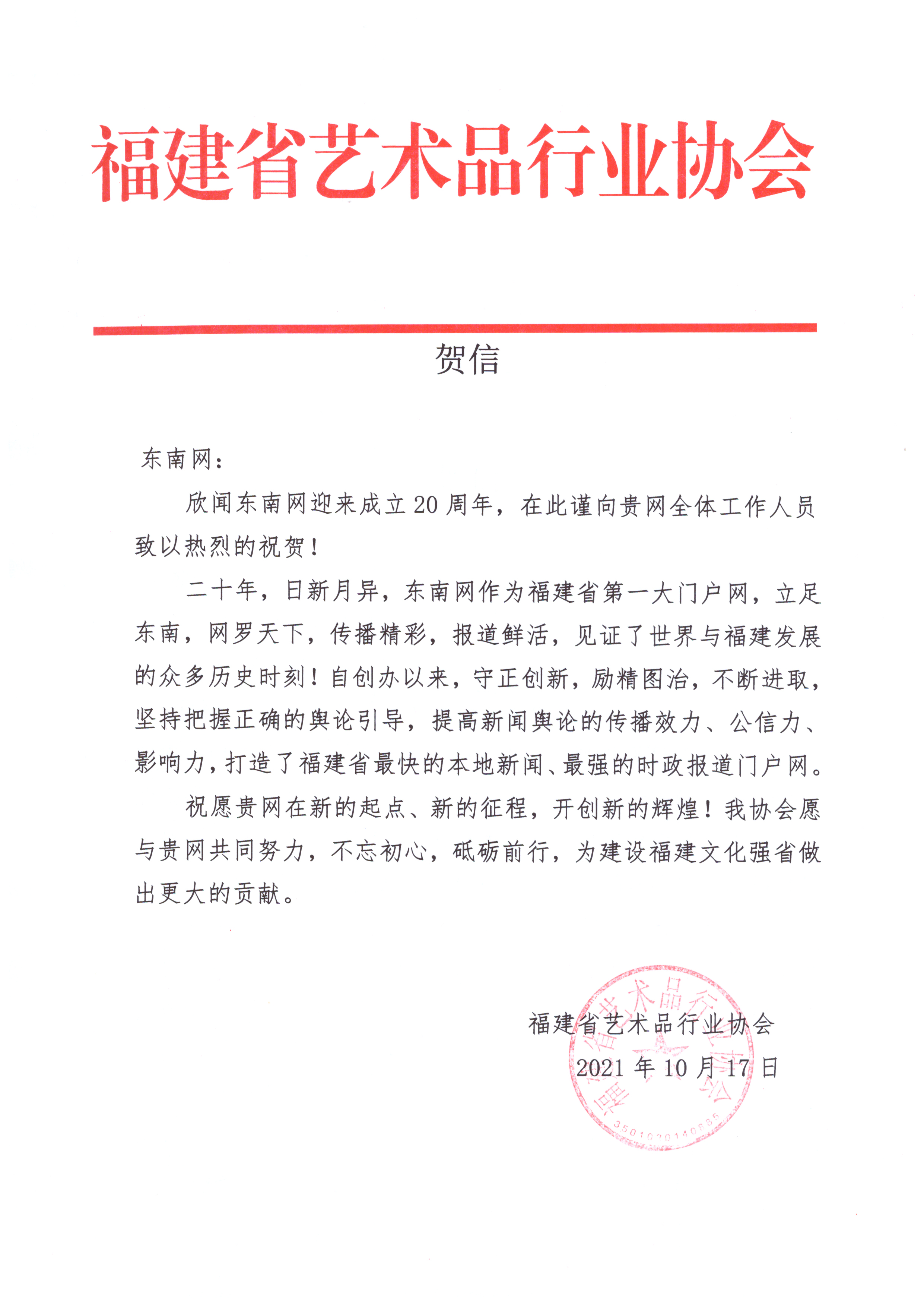 福建省藝術(shù)品行業(yè)協(xié)會(huì)賀信
