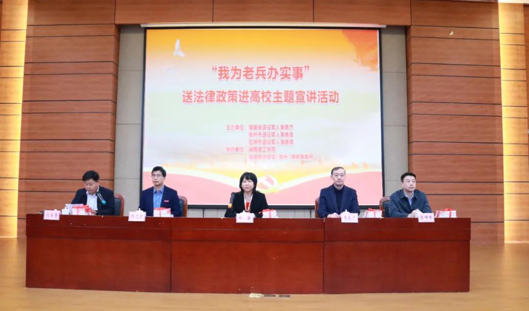 12月6日上午,由福建省退役軍人事務(wù)廳、泉州市退役軍人事務(wù)局和石獅市退役軍人事務(wù)局聯(lián)合舉辦的“我為老兵辦實(shí)事”法律政策進(jìn)高校主題宣講活動在閩南理工學(xué)院舉行。省退役軍人事務(wù)廳副廳長鄭敏出席并致辭。泉州市退役軍人事務(wù)局、石獅市退役軍人事務(wù)局和閩南理工學(xué)院等相關(guān)領(lǐng)導(dǎo)參加活動。