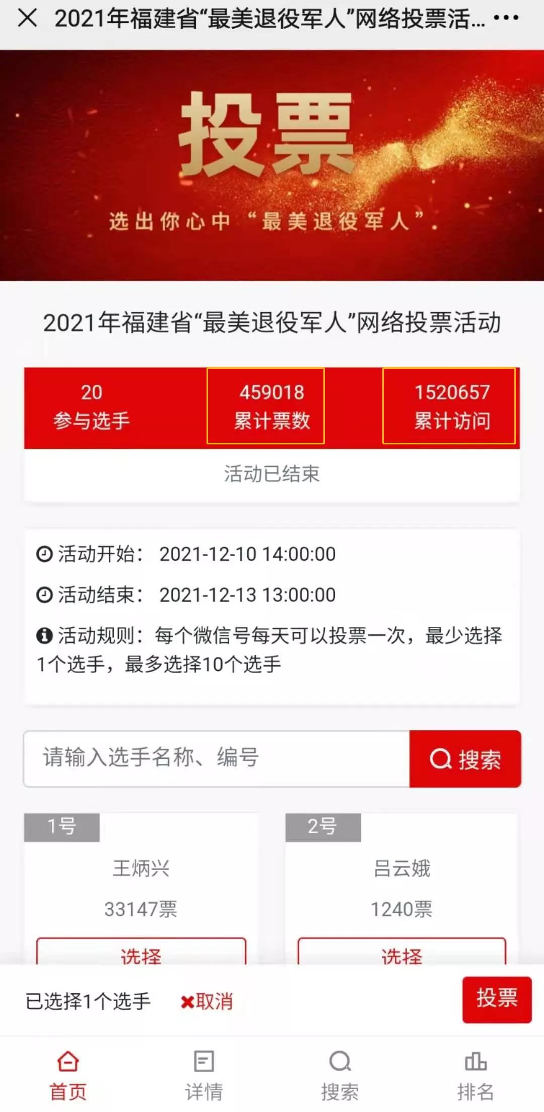 2021年福建省“最美退役軍人”網(wǎng)絡(luò)投票活動圓滿落幕!截止至2021年12月13日13:00,本次投票累計訪問人次達到了152萬,總計投票數(shù)45.9萬。本次微信投票結(jié)果將作為評選的參考,最終評選結(jié)果將于近日公布,不論最終結(jié)果如何,每一位入圍的退役軍人都值得我們尊敬,向你們致敬!