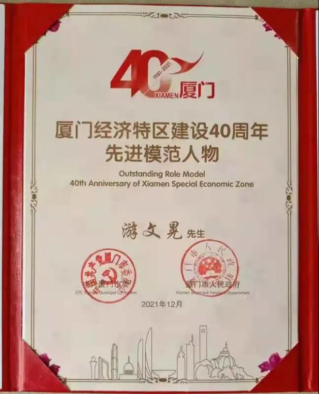 12月22日,廈門經濟特區(qū)建設40周年慶祝大會舉行。退役軍人游文晃喜獲“廈門經濟特區(qū)建設40周年先進模范人物”榮譽。