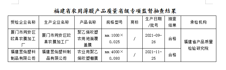 近期,依據(jù)《中華人民共和國產(chǎn)品質(zhì)量法》,福建省市場監(jiān)督管理局組織對農(nóng)用薄膜開展產(chǎn)品質(zhì)量省級專項(xiàng)監(jiān)督抽查,共抽查2家生產(chǎn)企業(yè)2批次產(chǎn)品,合格率為100%。
