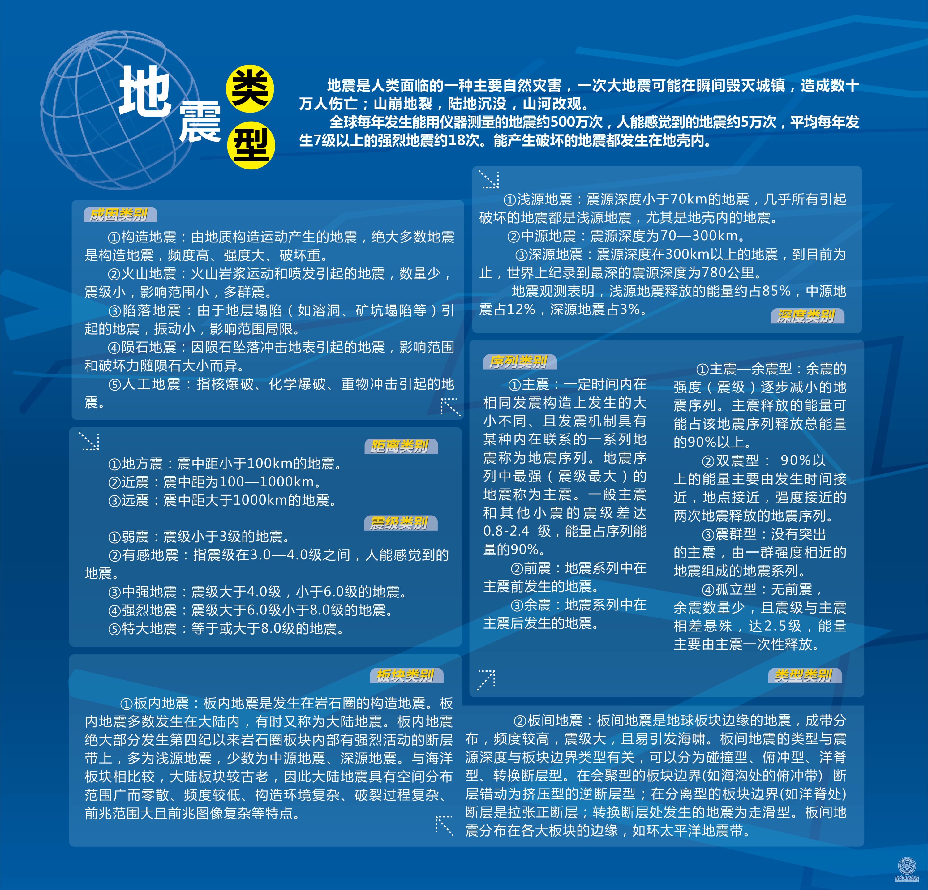 地震是人類面臨的一種主要自然災(zāi)害,一次大地震可能在瞬間毀滅城鎮(zhèn),造成數(shù)十萬人傷亡;山崩地裂,陸地沉沒,山河改觀。 全球每年發(fā)生能用儀器測量的地震約500萬次,人能感覺到的地震約5萬次,平均每年發(fā)生7級以上的強(qiáng)烈地震約18次。能產(chǎn)生破壞的地震都發(fā)生在地殼內(nèi)。 成因類別 ①構(gòu)造地震:由地質(zhì)構(gòu)造運(yùn)動產(chǎn)生的地震,絕大多數(shù)地震是構(gòu)造地震,頻度高、強(qiáng)度大、破壞重。 ②火山地震:火山巖漿運(yùn)動和噴發(fā)引起的地震,數(shù)量少,震級小,影響范圍小,多群震。 ③陷落地震:由于地層塌陷(如溶洞、礦坑塌陷等)引起的地震,振動小,影響范圍局限。 ④隕石地震:因隕石墜落沖擊地表引起的地震,影響范圍和破壞力隨隕石大小而異。 ⑤人工地震:指核爆破、化學(xué)爆破、重物沖擊引起的地震。 深度類別 ①淺源地震:震源深度小于70km的地震,幾乎所有引起破壞的地震都是淺源地震,尤其是地殼內(nèi)的地震。 ②中源地震:震源深度為70—300km。 ③深源地震:震源深度在300km以上的地震,到目前為止,世界上紀(jì)錄到最深的震源深度為780公里。 地震觀測表明,淺源地震釋放的能量約占85%,中源地震占12%,深源地震占3%。 距離類別 ①地方震:震中距小于100km的地震。 ②近震:震中距為100—1000km。 ③遠(yuǎn)震:震中距大于1000km的地震。 震級類別 ①弱震:震級小于3級的地震。 ②有感地震:指震級在3.0—4.0級之間,人能感覺到的地震。 ③中強(qiáng)地震:震級大于4.0級,小于6.0級的地震。 ④強(qiáng)烈地震:震級大于6.0級小于8.0級的地震。 ⑤特大地震:等于或大于8.0級的地震。 序列類別 ①主震:一定時(shí)間內(nèi)在相同發(fā)震構(gòu)造上發(fā)生的大小不同、且發(fā)震機(jī)制具有某種內(nèi)在聯(lián)系的一系列地震稱為地震序列。地震序列中最強(qiáng)(震級最大)的地震稱為主震。一般主震和其他小震的震級差達(dá)0.8-2.4 級,能量占序列能量的90%。 ②前震:地震系列中在主震前發(fā)生的地震。 ③余震:地震系列中在主震后發(fā)生的地震。 類型類別 ①主震—余震型:余震的強(qiáng)度(震級)逐步減小的地震序列。主震釋放的能量可能占該地震序列釋放總能量的90%以上。 ②雙震型:90%以上的能量主要由發(fā)生時(shí)間接近,地點(diǎn)接近,強(qiáng)度接近的兩次地震釋放的地震序列。 ③震群型:沒有突出的主震,由一群強(qiáng)度相近的地震組成的地震系列。 ④孤立型:無前震,余震數(shù)量少,且震級與主震相差懸殊,達(dá)2.5級,能量主要由主震一次性釋放。 板塊類別 ①板內(nèi)地震:板內(nèi)地震是發(fā)生在巖石圈的構(gòu)造地震。板內(nèi)地震多數(shù)發(fā)生在大陸內(nèi),有時(shí)又稱為大陸地震。板內(nèi)地震絕大部分發(fā)生第四紀(jì)以來巖石圈板塊內(nèi)部有強(qiáng)烈活動的斷層帶上,多為淺源地震,少數(shù)為中源地震、深源地震。與海洋板塊相比較,大陸板塊較古老,因此大陸地震具有空間分布范圍廣而零散、頻度較低、構(gòu)造環(huán)境復(fù)雜、破裂過程復(fù)雜、前兆范圍大且前兆圖像復(fù)雜等特點(diǎn)。 ②板間地震:板間地震是地球板塊邊緣的地震,成帶分布,頻度較高,震級大,且易引發(fā)海嘯。板間地震的類型與震源深度與板塊邊界類型有關(guān),可以分為碰撞型、俯沖型、洋脊型、轉(zhuǎn)換斷層型。在會聚型的板塊邊界(如海溝處的俯沖帶) 斷層錯(cuò)動為擠壓型的逆斷層型;在分離型的板塊邊界(如洋脊處) 斷層是拉張正斷層;轉(zhuǎn)換斷層處發(fā)生的地震為走滑型。板間地震分布在各大板塊的邊緣,如環(huán)太平洋地震帶。 |