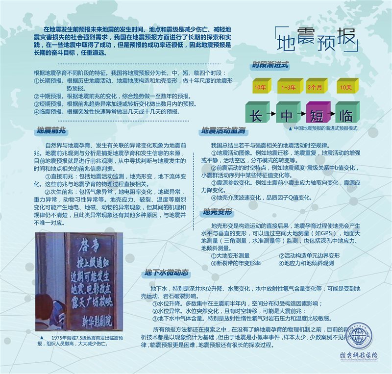 在地震發(fā)生前預(yù)報(bào)未來地震的發(fā)生時(shí)間、地點(diǎn)和震級(jí)是減少傷亡、減輕地震災(zāi)害損失的社會(huì)強(qiáng)烈需求,我國在地震預(yù)報(bào)方面進(jìn)行了長期的探索和實(shí)踐,在一些地震中取得了成功,但是預(yù)報(bào)的成功率還很低,因此地震預(yù)報(bào)是長期的奮斗目標(biāo),任重道遠(yuǎn)。 時(shí)段漸進(jìn)式 根據(jù)地震孕育不同階段的特征。我國將地震預(yù)報(bào)分為長、中、短、臨四個(gè)時(shí)段: ①長期預(yù)報(bào)。根據(jù)歷史地震活動(dòng)、地震地質(zhì)構(gòu)造和地殼變形,做十年尺度的地震形勢(shì)預(yù)報(bào)。 ②中期預(yù)報(bào)。根據(jù)地震前兆的變化,綜合趨勢(shì)做一至數(shù)年的預(yù)報(bào)。 ③短期預(yù)報(bào)。根據(jù)前兆趨勢(shì)異常加速或轉(zhuǎn)折變化做出數(shù)月內(nèi)的預(yù)報(bào)。 ④臨震預(yù)報(bào)。根據(jù)突發(fā)性快速異常做出幾天或十幾天的預(yù)報(bào)。 地震前兆 自然界與地震孕育、發(fā)生有關(guān)聯(lián)的異常變化現(xiàn)象為地震前兆。 ①直接前兆:包括地震活動(dòng)監(jiān)測(cè),地殼形變,地下流體變化。這些前兆與地震孕育的物理過程直接相關(guān)。 ②次生前兆:包括地電阻率變化,地磁異常,重力異常,動(dòng)物習(xí)性異常等。 |