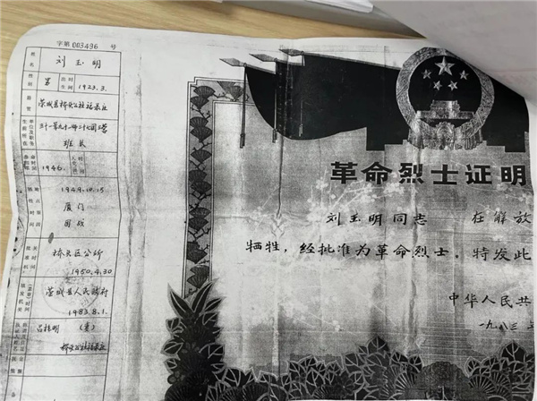 當(dāng)天下午,劉昌存來到龍海區(qū)退役軍人服務(wù)中心,向工作人員出示了一張革命烈士證明書,劉昌存向工作人員介紹了父親劉玉明的事跡。1946年劉玉明從山東榮成縣橋頭公社參軍入伍,1948年因傷回家休養(yǎng),同年養(yǎng)完傷后回歸原部隊(duì)。此時(shí)妻子呂桂明已經(jīng)懷有身孕,1949年10月,劉玉明因戰(zhàn)犧牲,部隊(duì)根據(jù)他本人所留地址將革命烈士證明送到家鄉(xiāng)(原件收藏于當(dāng)?shù)夭┪镳^),并留下口信,交代劉玉明犧牲后安葬于海澄縣革命烈士陵園。