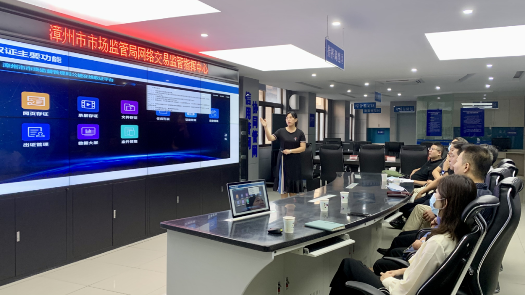 調(diào)研組首先參觀了漳州市局網(wǎng)絡(luò)交易監(jiān)管指揮中心。網(wǎng)監(jiān)分局同志匯報(bào)了市市場監(jiān)管局開展國家總局電子數(shù)據(jù)取證“雙試點(diǎn)”的工作成果,系統(tǒng)全面地展示了市局自主研發(fā)的公捷取證平臺(tái)、凌波聯(lián)盟鏈?,F(xiàn)場演示環(huán)節(jié),市局執(zhí)法人員熟練操作了電腦端網(wǎng)頁存證、錄屏存證、文件存證和移動(dòng)端錄屏存證等電子取證流程,高效準(zhǔn)確地展示出電子取證結(jié)果。