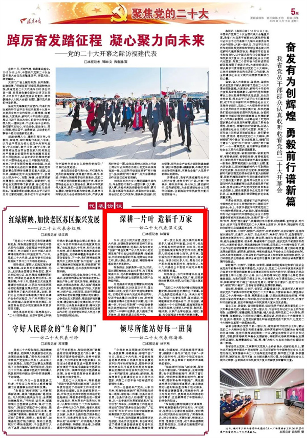 16日,走出人民大會堂,黨的二十大代表、安溪鐵觀音制作技藝傳習所主任溫文溪難掩激動,他表示,報告中有關“創(chuàng)新”“綠色發(fā)展”“以人民為中心的發(fā)展思想”等內(nèi)容讓他深受鼓舞、倍感振奮,作為來自基層的代表,他將結(jié)合本職工作,深入群眾、深入基層,將報告精神落實到火熱實踐中。 報告指出,創(chuàng)新是第一動力。對此,溫文溪深有體會。過去20多年,為了提高制茶水平,他不斷琢磨制茶理論和技術改良,用科研創(chuàng)新上的探索助力茶產(chǎn)業(yè)轉(zhuǎn)型升級。 為克服茶葉烘焙后需要長時間攤晾冷卻的難題,從2008至2017年,溫文溪潛心研究,發(fā)明了茶葉烘焙快速散熱機,實現(xiàn)在兩分鐘內(nèi)完成冷卻的同時,讓茶葉含水量從6%降到1.8%;針對制茶搖青依靠手工效率低下問題,他十年磨一劍,于2020年取得“一種自動做青機及其控制方法”發(fā)明專利;今年,他又發(fā)明了一種茶葉包揉機,極大提高了制茶效率,目前該機器正在投產(chǎn)中。 有一技之長后,溫文溪開始幫助更多人通過茶葉致富。2013年,他加入安溪縣農(nóng)民講師團;2016年,他成立安溪鐵觀音制作技藝傳習所,頻繁深入田間地頭精心指導。多年來,溫文溪先后開展講座800多場次,培訓學生、學員20000多人次;幫助100多戶茶農(nóng)提高制茶技藝、增加收入,和十幾戶建檔立卡貧困戶結(jié)對并幫助對方脫貧致富。 報告指出,當代中國青年生逢其時,施展才干的舞臺無比廣闊,實現(xiàn)夢想的前景無比光明。這引起了溫文溪的共鳴。 “黨的二十大報告對著力推動高質(zhì)量發(fā)展、推動綠色發(fā)展作出了部署。茶產(chǎn)業(yè)是典型的綠色產(chǎn)業(yè),未來大有可為。”作為一名青年黨員,溫文溪說,他將繼續(xù)在農(nóng)村埋頭苦干、開拓創(chuàng)新,通過解決一個個實際難題,提高制茶效率和茶葉品質(zhì),讓更多人種好茶、制好茶、喝好茶,以茶產(chǎn)業(yè)帶動就業(yè)、增收、致富,為全面推進鄉(xiāng)村振興貢獻力量。 |