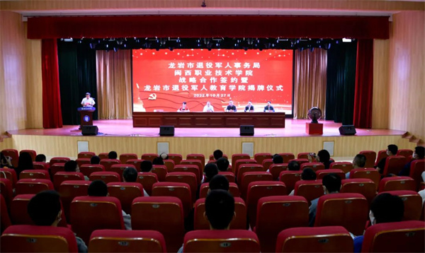 10月27日,閩西職業(yè)技術(shù)學(xué)院大匠堂內(nèi)燈光閃耀、掌聲雷動,龍巖市退役軍人事務(wù)局和閩西職業(yè)技術(shù)學(xué)院戰(zhàn)略合作簽約暨龍巖市退役軍人教育學(xué)院揭牌儀式在這里隆重舉行。龍巖市人民政府副市長廖深洪蒞臨指導(dǎo),閩西職業(yè)技術(shù)學(xué)院、龍巖市退役軍人事務(wù)局、四家優(yōu)待證合作銀行領(lǐng)導(dǎo)及學(xué)院退役軍人大學(xué)生代表參加儀式。