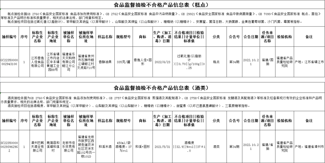 質(zhì)量指標(biāo)問(wèn)題:江蘇香逸人佳食品有限公司2022年6月23日生產(chǎn)的香酥油果,過(guò)氧化值(以脂肪計(jì))不合格,銷售單位為福建省樂(lè)天天購(gòu)物有限公司蚶江分公司,檢驗(yàn)機(jī)構(gòu)為福建省產(chǎn)品質(zhì)量檢驗(yàn)研究院;漳州巴戟天酒業(yè)有限公司2021年5月31日生產(chǎn)的和溪米酒,酒精度不合格,銷售單位為龍巖市佳樂(lè)貿(mào)易有限公司,檢驗(yàn)機(jī)構(gòu)為福建省產(chǎn)品質(zhì)量檢驗(yàn)研究院。