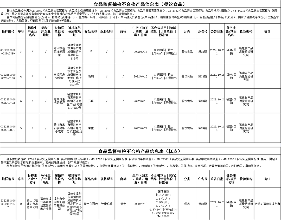 福建第34期監(jiān)督抽檢結(jié)果:22批次食品抽檢不合格!
