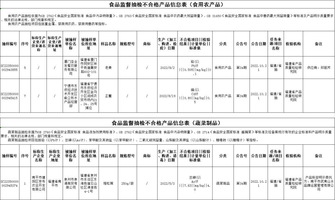 重金屬污染問(wèn)題:廈門圣全發(fā)餐飲服務(wù)有限公司銷售的老姜(購(gòu)進(jìn)日期為2022年8月2日),鉛(以Pb計(jì))不合格,檢驗(yàn)機(jī)構(gòu)為福建省產(chǎn)品質(zhì)量檢驗(yàn)研究院;寧德市東僑經(jīng)濟(jì)技術(shù)開(kāi)發(fā)區(qū)俞立彬水產(chǎn)品經(jīng)營(yíng)部銷售的正蟹(購(gòu)進(jìn)日期為2022年8月19日),鎘(以Cd計(jì))不合格,檢驗(yàn)機(jī)構(gòu)為福建省產(chǎn)品質(zhì)量檢驗(yàn)研究院;南平市建陽(yáng)區(qū)茶布農(nóng)業(yè)開(kāi)發(fā)有限公司2022年5月3日生產(chǎn)的姬松茸,總砷(以As計(jì))不合格,銷售單位為泉州市泉浦商貿(mào)有限公司,檢驗(yàn)機(jī)構(gòu)為福建省產(chǎn)品質(zhì)量檢驗(yàn)研究院。