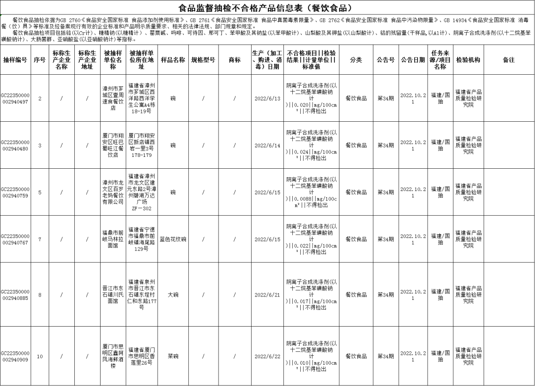 其他污染問(wèn)題:漳州市薌城區(qū)壹周速食餐飲店的碗(消毒日期為2022年6月13日),陰離子合成洗滌劑(以十二烷基苯磺酸鈉計(jì))不合格,檢驗(yàn)機(jī)構(gòu)為福建省產(chǎn)品質(zhì)量檢驗(yàn)研究院;廈門市翔安區(qū)旺巴蜀旺江餐飲店的碗(消毒日期為2022年6月14日),陰離子合成洗滌劑(以十二烷基苯磺酸鈉計(jì))不合格,檢驗(yàn)機(jī)構(gòu)為福建省產(chǎn)品質(zhì)量檢驗(yàn)研究院;漳州市龍文區(qū)百歲老媽餐飲有限公司的碗(消毒日期為2022年6月15日),陰離子合成洗滌劑(以十二烷基苯磺酸鈉計(jì))不合格,檢驗(yàn)機(jī)構(gòu)為福建省產(chǎn)品質(zhì)量檢驗(yàn)研究院;福鼎市前岐馬林拉面館的藍(lán)色花紋碗(消毒日期為2022年6月15日),陰離子合成洗滌劑(以十二烷基苯磺酸鈉計(jì))不合格,檢驗(yàn)機(jī)構(gòu)為福建省產(chǎn)品質(zhì)量檢驗(yàn)研究院;晉江市東石鎮(zhèn)川氏面館的大碗(消毒日期為2022年6月21日),陰離子合成洗滌劑(以十二烷基苯磺酸鈉計(jì))不合格,檢驗(yàn)機(jī)構(gòu)為福建省產(chǎn)品質(zhì)量檢驗(yàn)研究院;廈門市思明區(qū)鑫阿鳳海鮮酒樓的菜碗(消毒日期為2022年6月22日),陰離子合成洗滌劑(以十二烷基苯磺酸鈉計(jì))不合格,檢驗(yàn)機(jī)構(gòu)為福建省產(chǎn)品質(zhì)量檢驗(yàn)研究院。