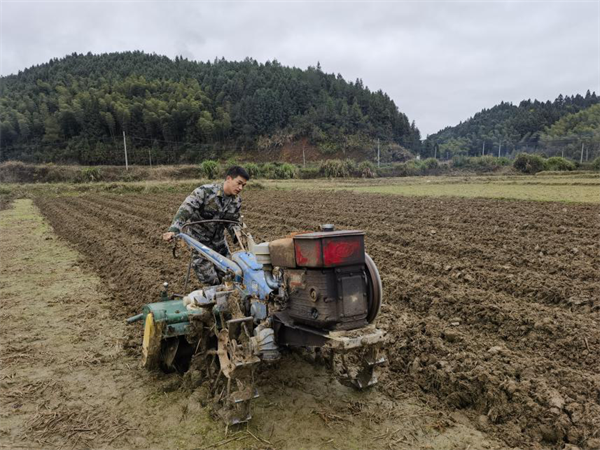 小山村里的奮斗者 2009年從部隊(duì)退役的丁水財(cái)開過(guò)出租車,當(dāng)過(guò)小時(shí)工,也做過(guò)生意,多地輾轉(zhuǎn)了8年,時(shí)值28歲的他上有老下有小,繁忙的工作讓他無(wú)暇顧及家人的生活,不能時(shí)常陪伴父母、妻子和孩子讓丁水財(cái)感到十分愧疚。2017年,他毅然放棄了手頭的事業(yè),回到了下渠鎮(zhèn)陳元村,自小與土地打交道的他靠著自身豐富的經(jīng)驗(yàn)扛起了鐵鍬和鋤頭,準(zhǔn)備在水美土沃的家鄉(xiāng)大干一場(chǎng)。 “一開始,很多人勸我種經(jīng)濟(jì)作物,說(shuō)更掙錢,但我從小就聽著老人家講沒糧吃的苦日子,所以我選擇種糧,而且要多種糧、種好糧?!眲偦卮謇锏哪莾赡辏婚T心思埋頭苦干,但當(dāng)理想扎根現(xiàn)實(shí),艱難往往是超出想象的,病蟲害、種植技術(shù)、人力有限等一系列問題接踵而至,遠(yuǎn)沒有想象中那么簡(jiǎn)單。曾在軍營(yíng)淬煉過(guò)的他始終堅(jiān)持迎難而上,技術(shù)不精就努力學(xué)習(xí)。就這樣,丁水財(cái)?shù)纳碛敖?jīng)常穿梭于各戶田野,經(jīng)常參加各級(jí)農(nóng)業(yè)技能培訓(xùn);漸漸地,良種陸續(xù)入田,結(jié)合科學(xué)有序的田間管理,丁水財(cái)迎來(lái)了第一個(gè)大豐收。這更加堅(jiān)定了他種糧的決心,“習(xí)近平總書記說(shuō),中國(guó)人的飯碗要牢牢端在自己手里。我們就得按照習(xí)近平總書記說(shuō)的,多種糧、種好糧,把這糧食的飯碗端的更牢。”丁水財(cái)說(shuō)道。 振興路上的新農(nóng)人 近幾年,由于外出務(wù)工人員多,缺少勞動(dòng)力,導(dǎo)致出現(xiàn)了不同程度的耕地撂荒現(xiàn)象。看著村里的撂荒地越來(lái)越多,丁水財(cái)心里止不住地惋惜。在鎮(zhèn)黨委的帶領(lǐng)下、村兩委的幫助下,他通過(guò)與農(nóng)戶簽訂合同流轉(zhuǎn)土地的方式,將下渠、陳元等村的撂荒地復(fù)耕復(fù)種,綜合應(yīng)用農(nóng)機(jī)與農(nóng)藝配套栽培技術(shù)開展煙葉、水稻種植?,F(xiàn)如今,丁水財(cái)?shù)霓r(nóng)耕面積從原來(lái)的7畝擴(kuò)大到40余畝,年收入也從原來(lái)的7萬(wàn)元增長(zhǎng)到30萬(wàn)元,他的種植大業(yè)越做越紅火。作為農(nóng)民中的新生力量,在自己增收之余,他還雇傭部分農(nóng)戶幫忙進(jìn)行土地托管,時(shí)不時(shí)的向他們傳授農(nóng)技知識(shí),提升耕種水平,進(jìn)一步增加農(nóng)戶收入。