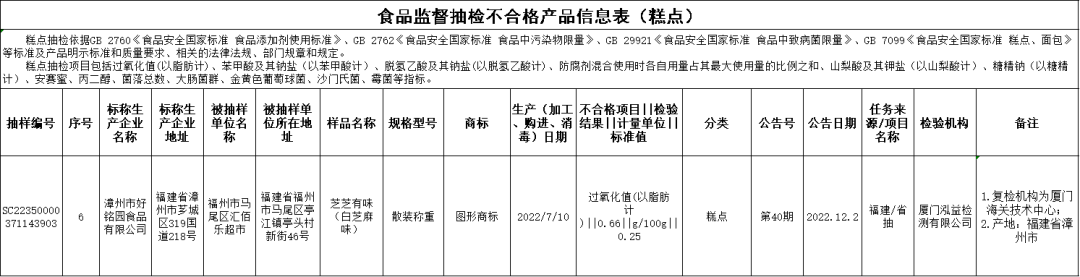 質(zhì)量指標問題 永嘉利(福建)食品有限公司2022年4月2日生產(chǎn)的美味來敲門(咸蛋黃味韌性餅干),過氧化值(以脂肪計)不合格,銷售單位為福建省邵武市華興嘉園超市有限公司,初檢機構(gòu)為福建賽福食品檢測研究所有限公司,復檢機構(gòu)為廈門海關(guān)技術(shù)中心; 龍海市漳龍食品有限公司2022年8月6日生產(chǎn)的魚皮花生(原味),過氧化值(以脂肪計)不合格,銷售單位為武平縣美杏食品店,初檢機構(gòu)為福建省產(chǎn)品質(zhì)量檢驗研究院,復檢機構(gòu)為福建中檢華日食品安全檢測有限公司; 福建漳州錦昌食品有限公司2022年8月17日生產(chǎn)的咸香糕,過氧化值(以脂肪計)不合格,銷售單位為詔安縣云寶食品店,初檢機構(gòu)為廈門海關(guān)技術(shù)中心,復檢機構(gòu)為福建省產(chǎn)品質(zhì)量檢驗研究院; 漳州市好銘園食品有限公司2022年7月10日生產(chǎn)的芝芝有味(白芝麻味),過氧化值(以脂肪計)不合格,銷售單位為福州市馬尾區(qū)匯佰樂超市,初檢機構(gòu)為廈門泓益檢測有限公司,復檢機構(gòu)為廈門海關(guān)技術(shù)中心; 漳州市佳辰糧油工貿(mào)有限公司2022年6月18日生產(chǎn)的一級成品大豆油,酸價(KOH)不合格,銷售單位為廈門世紀名流商貿(mào)有限公司,初檢機構(gòu)為廈門泓益檢測有限公司,復檢機構(gòu)為廈門海關(guān)技術(shù)中心。