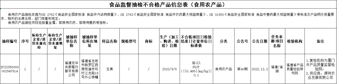 農(nóng)獸藥殘留問題 古田縣商業(yè)大世界農(nóng)貿(mào)市場魏錫旺銷售的長豆(購進日期為2022年8月24日),滅蠅胺不合格,初檢機構(gòu)為福建省產(chǎn)品質(zhì)量檢驗研究院,復檢機構(gòu)為福建中檢華日食品安全檢測有限公司; 福州睿德餐飲管理有限公司銷售的香蕉(購進日期為2022年9月2日),吡蟲啉不合格,初檢機構(gòu)為福建省產(chǎn)品質(zhì)量檢驗研究院,復檢機構(gòu)為福州海關(guān)技術(shù)中心; 福建中馳至膳食品有限公司銷售的香蕉(購進日期為2022年9月4日),噻蟲嗪不合格,初檢機構(gòu)為福建省產(chǎn)品質(zhì)量檢驗研究院,復檢機構(gòu)為福州海關(guān)技術(shù)中心; 廈門夏商營養(yǎng)餐有限公司銷售的姜(購進日期為2022年9月15日),噻蟲胺不合格,檢驗機構(gòu)為福建省產(chǎn)品質(zhì)量檢驗研究院; 沃爾瑪(福建)商業(yè)零售有限公司福州浦上大道分店銷售的包裝油麥菜(上市日期為2022年9月4日),腈菌唑不合格,初檢機構(gòu)為福建賽福食品檢測研究所有限公司,復檢機構(gòu)為廈門市產(chǎn)品質(zhì)量監(jiān)督檢驗院; 泉州市洛江萬安友誼自選商場銷售的韭菜(購進日期為2022年9月27日),毒死蜱不合格、腐霉利不合格,檢驗機構(gòu)為福州海關(guān)技術(shù)中心; 福建好多多商貿(mào)集團有限公司三明城市廣場分公司銷售的活牛蛙(購進日期為2022年9月19日),呋喃唑酮代謝物不合格,檢驗機構(gòu)為福州海關(guān)技術(shù)中心; 福建冠業(yè)投資發(fā)展有限公司南平萬達廣場店銷售的冰鮮鱸魚(海水魚)(購進日期為2022年9月21日),呋喃唑酮代謝物不合格,檢驗機構(gòu)為廈門泓益檢測有限公司; 福建冠業(yè)投資發(fā)展有限公司南平萬達廣場店銷售的冰鮮淡水瓜(淡水魚)(購進日期為2022年9月29日),恩諾沙星不合格,檢驗機構(gòu)為廈門泓益檢測有限公司; 福清市佳選超市有限公司銷售的豇豆(購進日期為2022年8月29日),甲胺磷不合格、克百威不合格、乙酰甲胺磷不合格,初檢機構(gòu)為福州海關(guān)技術(shù)中心,復檢機構(gòu)為福建省產(chǎn)品質(zhì)量檢驗研究院; 莆田市秀嶼區(qū)東莊鵬成食雜店銷售的菠菜(購進日期為2022年9月21日),毒死蜱不合格,檢驗機構(gòu)為福州海關(guān)技術(shù)中心; 福建中禾食品科技有限責任公司銷售的生姜(購進日期為2022年9月16日),噻蟲胺不合格,檢驗機構(gòu)為福建省產(chǎn)品質(zhì)量檢驗研究院; 廈門夏商百貨集團三明有限公司三元店銷售的活牛蛙(購進日期為2022年9月21日),呋喃唑酮代謝物不合格,檢驗機構(gòu)為廈門泓益檢測有限公司; 廈門夏商百貨集團三明有限公司三元店銷售的菠菜(購進日期為2022年9月22日),毒死蜱不合格,檢驗機構(gòu)為廈門泓益檢測有限公司; 廈門潤澤夏福貿(mào)易有限公司銷售的長豆(豇豆)(購進日期為2022年9月28日),水胺硫磷不合格、倍硫磷不合格、甲基異柳磷不合格,檢驗機構(gòu)為福建賽福食品檢測研究所有限公司。