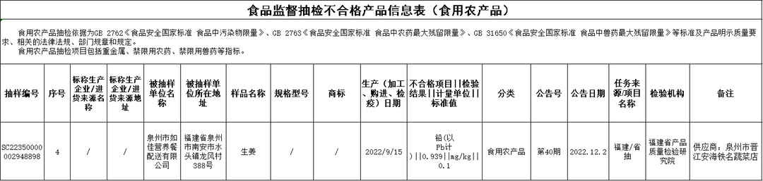 重金屬污染問題 永輝超市有限公司漳州萬科里店銷售的田趣官塢小海帶結(jié)(購進日期為2022年8月19日),鉛(以Pb計)不合格,初檢機構(gòu)為福建省產(chǎn)品質(zhì)量檢驗研究院,復檢機構(gòu)為福州海關(guān)技術(shù)中心。 福建宏華央廚餐飲服務(wù)有限公司銷售的生姜(購進日期為2022年9月6日),鉛(以Pb計)不合格,初檢機構(gòu)為福建省產(chǎn)品質(zhì)量檢驗研究院,復檢機構(gòu)為廈門市產(chǎn)品質(zhì)量監(jiān)督檢驗院; 泉州市如佳營養(yǎng)餐配送有限公司銷售的生姜(購進日期為2022年9月15日),鉛(以Pb計)不合格,檢驗機構(gòu)為福建省產(chǎn)品質(zhì)量檢驗研究院; 永輝超市股份有限公司福建福州公園道超市銷售的公正蟹(活)(購進日期為2022年8月31日),鎘(以Cd計)不合格,初檢機構(gòu)為南京海關(guān)動植物與食品檢測中心,復檢機構(gòu)為福建省產(chǎn)品質(zhì)量檢驗研究院; 晉江市池店鎮(zhèn)松東蔬菜行銷售的老姜(購進日期為2022年9月26日),鉛(以Pb計)不合格,檢驗機構(gòu)為福州海關(guān)技術(shù)中心; 廈門夏商百貨集團南平有限公司建甌時代店銷售的茄子(購進日期為2022年10月1日),鎘(以Cd計)不合格,檢驗機構(gòu)為廈門泓益檢測有限公司; 福建省建甌市福瑞生鮮超市有限公司銷售的青絲茄(購進日期為2022年9月30日),鎘(以Cd計)不合格,檢驗機構(gòu)為廈門泓益檢測有限公司; 晉江潤德商業(yè)有限公司銷售的老姜(購進日期為2022年9月18日),鉛(以Pb計)不合格,檢驗機構(gòu)為福州海關(guān)技術(shù)中心。