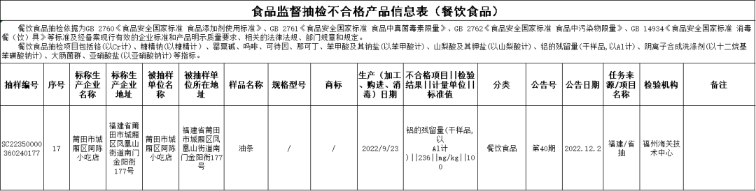 俗話說 人是鐵,飯是鋼 一頓不吃餓得慌 守護老百姓“舌尖上的安全” 我們一直在路上 最新一期食品抽檢結(jié)果 新!鮮!出!爐! 快來看看 第40期公告的監(jiān)督抽檢信息涉及22大類食品1566批次,包括:糧食加工品、食用油(含油脂及其制品)、調(diào)味品、肉制品、乳制品、飲料、方便食品、餅干、冷凍飲品、速凍食品、薯類和膨化食品、糖果制品、茶葉及相關(guān)制品、酒類、水果制品、炒貨食品及堅果制品、水產(chǎn)制品、糕點、豆制品、保健食品、餐飲食品(含餐飲具)、食用農(nóng)產(chǎn)品。合格1514批次,不合格52批次。涉及食品添加劑問題、微生物污染問題、重金屬污染問題、農(nóng)獸藥殘留問題、質(zhì)量指標問題、其他污染問題。 食品添加劑問題 漳平市阿川小吃店的油條(加工日期為2022年10月5日),鋁的殘留量(干樣品,以Al計)不合格,檢驗機構(gòu)為福州海關(guān)技術(shù)中心; 晉江市青陽晉仙小吃店的油條(加工日期為2022年10月5日),鋁的殘留量(干樣品,以Al計)不合格,檢驗機構(gòu)為廈門海關(guān)技術(shù)中心; 廈門市同安區(qū)清渝小吃店的油條(加工日期為2022年9月27日),鋁的殘留量(干樣品,以Al計)不合格,檢驗機構(gòu)為福建省產(chǎn)品質(zhì)量檢驗研究院; 莆田市城廂區(qū)阿陳小吃店的油條(加工日期為2022年9月23日),鋁的殘留量(干樣品,以Al計)不合格,檢驗機構(gòu)為福州海關(guān)技術(shù)中心; 福建宇之潤食品有限公司2022年7月5日生產(chǎn)的紫薯燒小面包(紫薯味),苯甲酸及其鈉鹽(以苯甲酸計)不合格,銷售單位為廈門市同安區(qū)誼品陽光便利店,初檢機構(gòu)為福州海關(guān)技術(shù)中心,復檢機構(gòu)為廈門市產(chǎn)品質(zhì)量監(jiān)督檢驗院; 漳州市旺豐香食品有限公司2022年9月3日生產(chǎn)的水果小卷蛋糕,脫氫乙酸及其鈉鹽(以脫氫乙酸計)不合格、防腐劑混合使用時各自用量占其最大使用量的比例之和不合格,銷售單位為福州市晉安區(qū)興福興超市有限公司,檢驗機構(gòu)為福建賽福食品檢測研究所有限公司; 龍海市正豐食品有限公司2022年9月7日生產(chǎn)的鳳凰蛋酥(原味),丙二醇不合格,銷售單位為泰寧縣秀娟便利店,檢驗機構(gòu)為福州海關(guān)技術(shù)中心。