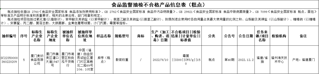 微生物污染問題 莆田市涵江區(qū)京味餐館的白色花紋碗(消毒日期為2022年9月26日),大腸菌群不合格,檢驗機構(gòu)為福建省產(chǎn)品質(zhì)量檢驗研究院; 福清市音西歡喜餐飲店的圓盤(消毒日期為2022年9月28日),大腸菌群不合格,檢驗機構(gòu)為福建省產(chǎn)品質(zhì)量檢驗研究院; 福清市音西歡喜餐飲店的三角盤(消毒日期為2022年9月28日),大腸菌群不合格,檢驗機構(gòu)為福建省產(chǎn)品質(zhì)量檢驗研究院; 廈門麥初食品有限公司2022年9月10日生產(chǎn)的麻棗(糕點),霉菌不合格,銷售單位為廈門市湖里區(qū)秋良泓干貨商行,檢驗機構(gòu)為福州海關(guān)技術(shù)中心; 晉江市百泉食品飲料有限公司2022年8月31日生產(chǎn)的思必特果味型碳酸飲料(檸檬味),菌落總數(shù)不合格,銷售單位為安溪縣鳳城聯(lián)財副食品店,檢驗機構(gòu)為廈門海關(guān)技術(shù)中心。