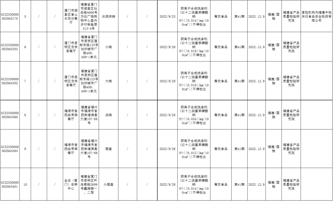 其他污染問題 廈門市湖里區(qū)食山水陽光餐廳的冰淇淋碗(消毒日期為2022年9月23日),陰離子合成洗滌劑(以十二烷基苯磺酸鈉計)不合格,初檢機(jī)構(gòu)為福建省產(chǎn)品質(zhì)量檢驗研究院,復(fù)檢機(jī)構(gòu)為福建中檢華日食品安全檢測有限公司; 廈門市思明區(qū)龍俠客餐廳的小碗(消毒日期為2022年9月28日),陰離子合成洗滌劑(以十二烷基苯磺酸鈉計)不合格,檢驗機(jī)構(gòu)為福建省產(chǎn)品質(zhì)量檢驗研究院; 廈門市思明區(qū)龍俠客餐廳的大碗(消毒日期為2022年9月28日),陰離子合成洗滌劑(以十二烷基苯磺酸鈉計)不合格,檢驗機(jī)構(gòu)為福建省產(chǎn)品質(zhì)量檢驗研究院; 福清市音西焱尋御餐廳的湯碗(消毒日期為2022年9月28日),陰離子合成洗滌劑(以十二烷基苯磺酸鈉計)不合格,檢驗機(jī)構(gòu)為福建省產(chǎn)品質(zhì)量檢驗研究院; 福清市音西焱尋御餐廳的圓盤(消毒日期為2022年9月28日),陰離子合成洗滌劑(以十二烷基苯磺酸鈉計)不合格,檢驗機(jī)構(gòu)為福建省產(chǎn)品質(zhì)量檢驗研究院; 全總(廈門)安養(yǎng)中心的小圓盤(消毒日期為2022年9月28日),陰離子合成洗滌劑(以十二烷基苯磺酸鈉計)不合格,檢驗機(jī)構(gòu)為福建省產(chǎn)品質(zhì)量檢驗研究院; 廈門市丫滿意女王餐飲管理有限公司的小碗(消毒日期為2022年10月13日),陰離子合成洗滌劑(以十二烷基苯磺酸鈉計)不合格、大腸菌群不合格,檢驗機(jī)構(gòu)為福建省產(chǎn)品質(zhì)量檢驗研究院; 廈門市丫滿意女王餐飲管理有限公司的小方碟(消毒日期為2022年10月13日),陰離子合成洗滌劑(以十二烷基苯磺酸鈉計)不合格,檢驗機(jī)構(gòu)為福建省產(chǎn)品質(zhì)量檢驗研究院; 廈門市味友閩南宴文化推廣有限公司的塑料杯子(消毒日期為2022年9月23日),陰離子合成洗滌劑(以十二烷基苯磺酸鈉計)不合格,初檢機(jī)構(gòu)為福建省產(chǎn)品質(zhì)量檢驗研究院,復(fù)檢機(jī)構(gòu)為福建中檢華日食品安全檢測有限公司; 廈門市味友閩南宴文化推廣有限公司的飯碗(消毒日期為2022年9月23日),陰離子合成洗滌劑(以十二烷基苯磺酸鈉計)不合格,初檢機(jī)構(gòu)為福建省產(chǎn)品質(zhì)量檢驗研究院,復(fù)檢機(jī)構(gòu)為福建中檢華日食品安全檢測有限公司; 廈門市味友閩南宴文化推廣有限公司的云吞碗(消毒日期為2022年9月23日),陰離子合成洗滌劑(以十二烷基苯磺酸鈉計)不合格,初檢機(jī)構(gòu)為福建省產(chǎn)品質(zhì)量檢驗研究院,復(fù)檢機(jī)構(gòu)為福建中檢華日食品安全檢測有限公司; 標(biāo)稱福州市長樂區(qū)潘敏生花生加工廠2022年9月1日生產(chǎn)的油炸花生,黃曲霉毒素B?不合格,銷售單位為福州市鑫惠航超市有限責(zé)任公司,初檢機(jī)構(gòu)為廈門海關(guān)技術(shù)中心,復(fù)檢機(jī)構(gòu)為福建省產(chǎn)品質(zhì)量檢驗研究院; 標(biāo)稱泉州益浪食品有限公司2022年9月6日生產(chǎn)的津浪飲用純凈水,亞硝酸鹽(以NO2-計)不合格,銷售單位為石獅市博源桶裝水經(jīng)營部,初檢機(jī)構(gòu)為廈門海關(guān)技術(shù)中心,復(fù)檢機(jī)構(gòu)為廈門市產(chǎn)品質(zhì)量監(jiān)督檢驗院。