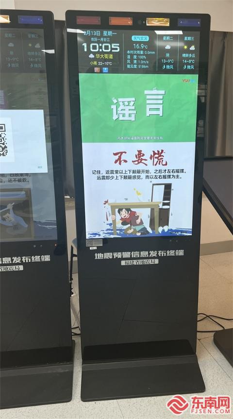 地震預(yù)警信息發(fā)布終端。東南網(wǎng)記者 周霞 攝 就地避險最重要 謹(jǐn)防二次傷害 地震發(fā)生持續(xù)時間往往較短,因此避險必須及時果斷、因地制宜。最佳避險方法是遠(yuǎn)離建筑物,逃生至空曠開闊的廣場、公園等場所,俯身保護(hù)頭部?!叭绻麤]來得及跑,一定要保持穩(wěn)定的情緒,觀察周邊情形,藏身到堅硬牢固的區(qū)域,比如桌下、床下,立刻蹲下并用手或枕頭遮擋頭部,以防傷害?!崩钴娞崾荆诘卣鸩ńY(jié)束后,要立即觀察周邊環(huán)境,在確保安全的情況下立即逃生,盡量不要返回室內(nèi)。 如不幸被掩埋在地震廢墟中,應(yīng)保存體力,勿大聲喊叫,可以利用敲擊制造響聲來引起救援人員的注意。“有條件時,要盡量加固或擴(kuò)展自己被困的區(qū)域,以防余震對自己造成二次傷害?!崩钴娊ㄗh。