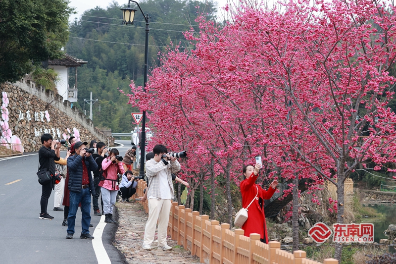 艷麗的櫻花吸引了許多攝影愛好者前來取景。陳英杰 攝 東南網(wǎng)2月15日訊(通訊員 陳英杰)初春的閩南大地,一派勃勃生機。日前,德化縣“花開瓷都·‘櫻’你浪漫”櫻花節(jié)活動在雷峰鎮(zhèn)潘祠村櫻花園舉辦, 千畝近100萬株福建山櫻花優(yōu)雅綻放、競相爭艷,宛若“群櫻薈萃”,成為雷峰鎮(zhèn)一道獨特的風(fēng)景線,吸引眾多游客爭相來打卡體驗。
