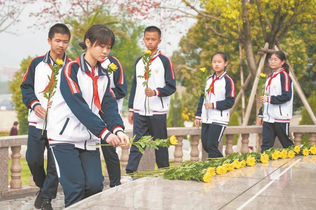 4月2日上午,漳州市華僑中學(xué)師生到市烈士陵園祭奠。楊紀(jì)翔 攝 百園千校祭英烈 3月27日,福建省軍地領(lǐng)導(dǎo)與福州市機關(guān)單位工作人員、退役軍人及師生代表等200余人,來到福州市文林山革命烈士陵園,舉行“百園千校清明祭英烈”活動啟動儀式。9時30分,全體人員整齊列隊,莊嚴(yán)肅立,鞠躬默哀。隨著《獻(xiàn)花曲》奏響,大家手持鮮花拾階緩行,依次將鮮花擺在革命烈士紀(jì)念碑前寄托哀思。隨后,在烈士陵園講解員的引導(dǎo)下,師生代表來到烈士墓區(qū)開展“傾聽一段紅色故事”“書寫一張寄語卡片”等活動,表達(dá)對英烈的崇敬之情。 據(jù)了解,全省現(xiàn)有烈士紀(jì)念設(shè)施14923個,其中國家級8個、省級7個、市級15個、縣級132個,碑亭塔祠等紀(jì)念設(shè)施559個,烈士墓14202個?!鞍亚行W(xué)校師生組織起來開展系列緬懷英烈活動,旨在引導(dǎo)廣大青少年在回望歷史中傳承紅色基因,銘記歷史使命,厚植家國情懷。”省退役軍人事務(wù)廳優(yōu)撫褒揚處處長潘永意表示,3月27日至4月10日,省退役軍人事務(wù)廳計劃組織全省千所中小學(xué)在校師生,到烈士陵園開展“擦拭一遍墓碑、敬獻(xiàn)一束鮮花、進(jìn)行一次描金描紅、重溫入團(tuán)(入隊)誓詞、寫一張寄語卡片、講述先烈故事”等活動,并同步開展主題班隊會、團(tuán)(隊)日活動等。 3月28日,寧德市屏南縣革命烈士陵園迎來屏南縣古峰鎮(zhèn)第二小學(xué)的學(xué)生。他們帶來橘子、鮮花和卡片,放在衛(wèi)國戍邊烈士陳祥榕遺像前。一張張卡片上寫滿對烈士的思念,“祥榕哥哥,吃口橘子吧,甜甜的”“去時少年身,歸來烈士魂”“陳祥榕哥哥,您是我心中的英雄,是我學(xué)習(xí)的榜樣”…… 3月28日,泰寧縣在爐峰山革命烈士紀(jì)念園開展清明祭英烈活動,全體人員莊嚴(yán)肅立,鞠躬默哀,學(xué)生代表向革命烈士紀(jì)念碑敬獻(xiàn)花籃、寄語卡片,少先隊員獻(xiàn)唱《我們是共產(chǎn)主義接班人》,深切緬懷革命烈士。隨后,大家走進(jìn)紅軍亭和英勇東方軍展館,聆聽英雄戰(zhàn)斗的故事,感悟熱血戰(zhàn)史,接受愛國主義教育。 3月28日,明溪縣師生代表、退役軍人代表、機關(guān)單位干部等120多人來到明溪縣革命紀(jì)念園,大家懷著崇敬的心情,打掃紀(jì)念廣場、烈士集中安葬區(qū),擦拭烈士墓碑、烈士英名墻等紀(jì)念設(shè)施。隨后,全體人員整齊列隊,莊嚴(yán)肅立,鞠躬默哀,并瞻仰烈士墓、烈士英名墻和革命英雄紀(jì)念碑,依次將鮮花擺在紀(jì)念設(shè)施前寄托哀思。