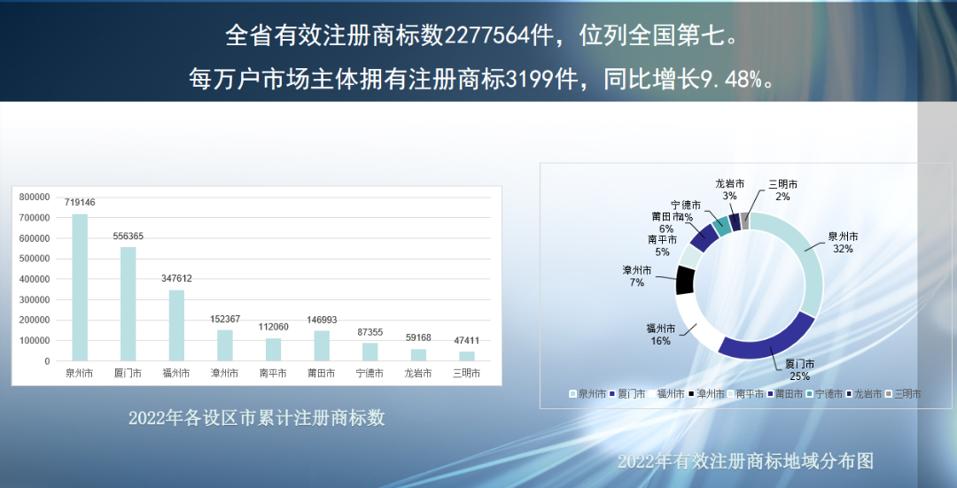 為深入學(xué)習(xí)貫徹黨的二十大精神,全面落實(shí)習(xí)近平總書記關(guān)于知識(shí)產(chǎn)權(quán)工作的重要指示論述,宣傳展示福建省2022年度商標(biāo)與地理標(biāo)志工作成效,4月24日,省市場(chǎng)監(jiān)管局(知識(shí)產(chǎn)權(quán)局)發(fā)布《福建省商標(biāo)與地理標(biāo)志發(fā)展報(bào)告(2022年度)》(以下簡(jiǎn)稱《報(bào)告》)。 《報(bào)告》顯示,2022年度,福建省新增有效注冊(cè)商標(biāo)327483件,有效注冊(cè)商標(biāo)數(shù)2277564件,位列全國(guó)第七位;每萬(wàn)戶市場(chǎng)主體擁有注冊(cè)商標(biāo)3199件,同比增長(zhǎng)9.48%;新增地理標(biāo)志商標(biāo)41件,地理標(biāo)志商標(biāo)數(shù)633件,位列全國(guó)第二位。