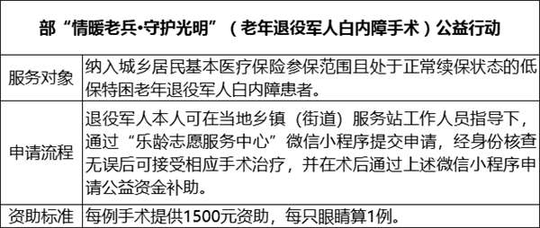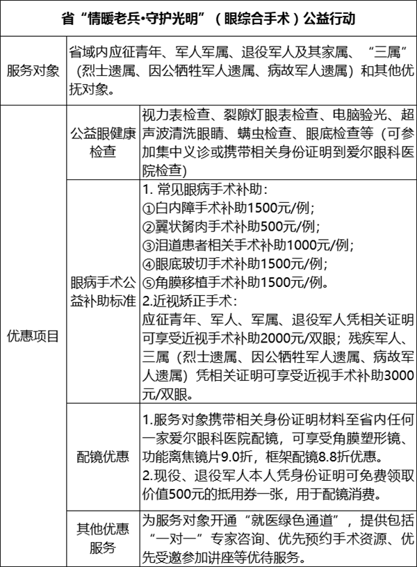 目前,我省已被退役軍人事務(wù)部列為“情暖老兵·守護(hù)光明”公益行動(dòng)首批試點(diǎn)省份。省退役軍人服務(wù)中心指導(dǎo)省退役軍人關(guān)愛協(xié)會(huì)、愛爾眼科醫(yī)院福建省區(qū)同步推進(jìn)部、省兩項(xiàng)公益行動(dòng),目前,已完成前期工作,下一步將在全省范圍內(nèi)開展眼健康義診活動(dòng)和手術(shù)治療服務(wù)。 部、省“情暖老兵·守護(hù)光明”公益行動(dòng)內(nèi)容