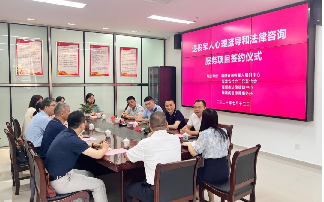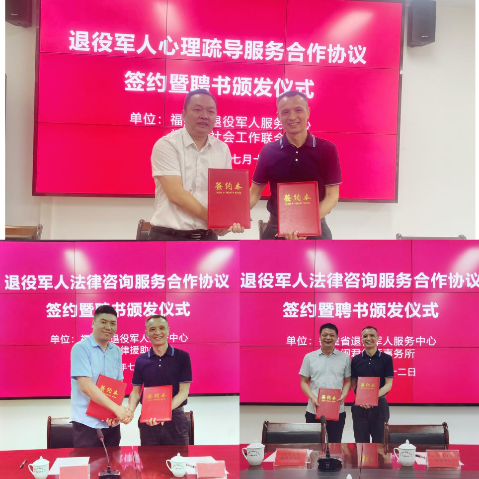 7月12日上午,在省退役軍人事務(wù)廳指導(dǎo)下,在省司法廳大力支持下,省退役軍人服務(wù)中心與省社會(huì)工作聯(lián)合會(huì)、福州市法律援助中心、福建閩君律師事務(wù)所舉辦“退役軍人心理疏導(dǎo)和法律咨詢服務(wù)項(xiàng)目”簽約儀式。