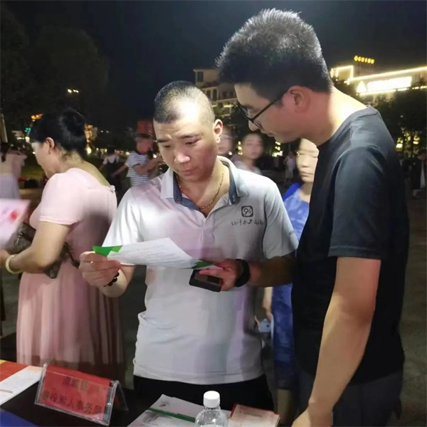 浦城縣丹桂廣場舉辦2023年百日千萬招聘專項行動暨大中專畢業(yè)生專場招聘會 “老班長,晚上好!您是過來找工作嗎?有看到比較合適的崗位嗎?”招聘會現(xiàn)場,浦城縣退役軍人事務(wù)局特別設(shè)立政策咨詢專區(qū)和就業(yè)推薦專區(qū),為退役軍人免費提供就業(yè)創(chuàng)業(yè)政策咨詢和就業(yè)崗位推薦。本次專項招聘會共有58家企業(yè)參會,為退役軍人提供就業(yè)崗位千余個,涵蓋銷售、新媒體、互聯(lián)網(wǎng)、安保等多個行業(yè),有5名退役軍人初步達(dá)成就業(yè)意向。