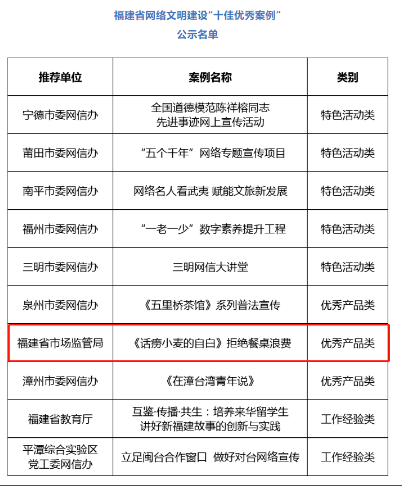 其中,福建省市場監(jiān)管局推薦案例 “《話癆小麥的自白》拒絕餐飲浪費” 獲評福建省網(wǎng)絡(luò)文明建設(shè) “十佳優(yōu)秀案例” |