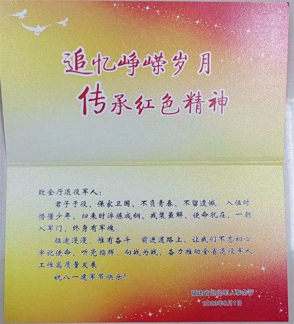 座談會(huì)上,廳黨組向全廳退役軍人贈(zèng)送賀卡和《習(xí)近平著作選讀》等理論書(shū)籍,集體合唱《中國(guó)人民解放軍軍歌》《沒(méi)有共產(chǎn)黨就沒(méi)有新中國(guó)》。梁晨磊、萬(wàn)小強(qiáng)、王江文、羅勛章、林玉琴、曾峻茂等6名同志作交流發(fā)言,大家回顧激情豪邁的軍旅生涯,暢談從事新時(shí)代退役軍人工作的心得體會(huì),一致表示深刻感受到廳黨組的關(guān)心關(guān)懷和退役軍人事務(wù)部門(mén)這個(gè)大家庭的溫暖,將始終保持軍人本色,對(duì)黨忠誠(chéng)、牢記使命、服務(wù)人民,始終保持軍人品格,甘于奉獻(xiàn)、主動(dòng)擔(dān)當(dāng)、勇于拼搏,始終保持軍人的紀(jì)律作風(fēng),服從命令、聽(tīng)從指揮,雷厲風(fēng)行,以退役軍人工作高質(zhì)量發(fā)展的實(shí)際行動(dòng),讓全省退役軍人更加滿意,讓駐閩部隊(duì)更加滿意,讓黨委政府更加放心,為譜寫(xiě)中國(guó)式現(xiàn)代化福建篇章作出更大貢獻(xiàn)。