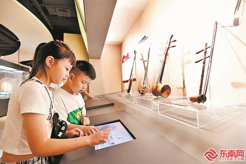 中秋國慶假期,在泉州非物質(zhì)文化遺產(chǎn)館里,小游客通過觸摸屏了解當?shù)胤沁z北管樂器知識。福建日報記者 林輝 攝