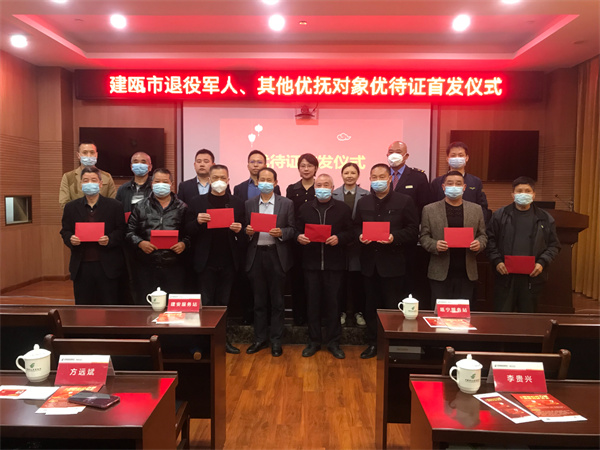2022年4月18日,建甌市舉辦退役軍人優(yōu)待證首發(fā)儀式 認真做好信息采集和優(yōu)待證辦理,全面采集退役軍人信息,優(yōu)待證制卡5.7萬余張,并為軍屬和退役軍人家庭懸掛光榮牌。南平市本級和各縣(市、區(qū))均成立烈士紀念設(shè)施保護中心,各地每年預(yù)算10—30萬元作為烈保工作經(jīng)費。爭取中央、省級資金2500余萬元用于烈士紀念設(shè)施修繕維護、改造提升、散葬墓集中遷移等工作,并落實好“六個一”管護機制。建好管好用好烈士紀念設(shè)施,廣泛開展清明祭掃和“9·30”烈士公祭、“學黨史緬懷英烈”等活動,弘揚傳承英烈精神。積極開展“為烈士尋親”“為烈士立傳”工作 ,讓更多烈士“回家”。通過光榮牌懸掛、立功受獎送喜報、新兵入伍歡送、退役返鄉(xiāng)歡迎等方式,營造“讓軍人成為全社會尊崇的職業(yè),讓退役軍人成為全社會尊重的人”的社會氛圍。