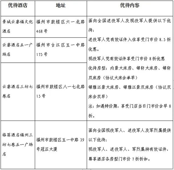 儀式上,田德強(qiáng)表示,鼓樓區(qū)是駐軍大區(qū),素有擁軍優(yōu)屬,擁政愛民的光榮傳統(tǒng),非常感謝擁軍酒店支持鼓樓區(qū)雙擁工作,以最大的優(yōu)惠和誠意服務(wù)現(xiàn)役和退役軍人。 酒店負(fù)責(zé)人紛紛表示加入鼓樓區(qū)“愛國擁軍聯(lián)盟”既是榮譽(yù)更是責(zé)任,今后酒店將強(qiáng)化管理、優(yōu)化服務(wù),讓廣大現(xiàn)役軍人、退役軍人和軍屬充分感受到溫暖,為鼓樓區(qū)雙擁工作增光添彩。 根據(jù)協(xié)議,福州星宸未來酒店管理有限公司旗下景城云睿福文化酒店、云睿酒店五一廣場店、云睿酒店三坊七巷店,福州金星商務(wù)酒店有限責(zé)任公司(格菲酒店)將提供以下優(yōu)待: 擁軍酒店住宿優(yōu)待目錄清單