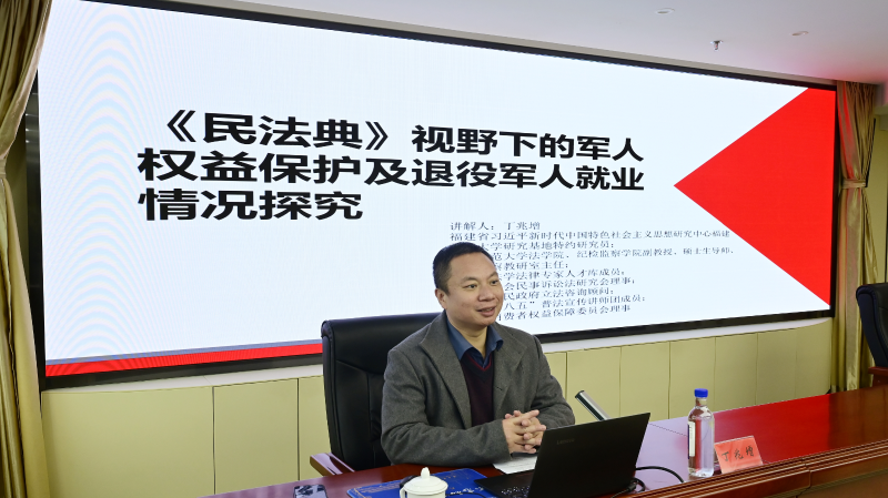 為推動機關(guān)工作人員學(xué)法守法用法,按照省委宣傳部、省委依法治省辦關(guān)于2023年“憲法宣傳周”工作方案部署,12月6日下午,省退役軍人事務(wù)廳舉辦第42期軍民情講壇,邀請福建師范大學(xué)法學(xué)院丁兆增副教授以“《民法典》視野下的軍人權(quán)益保護及退役軍人就業(yè)情況”為題進行法治專題宣講。廳在家領(lǐng)導(dǎo),在榕所屬單位主要負責(zé)人在主會場,所屬單位其他同志在分會場視頻聆聽講座。
