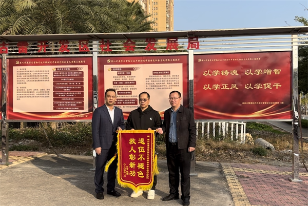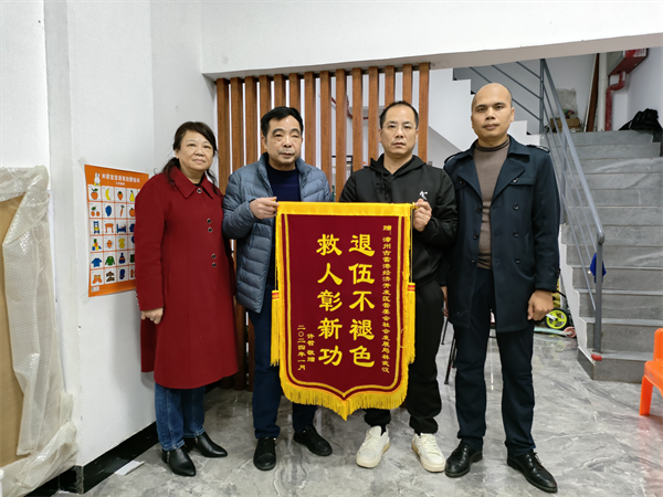 1月3日下午,落水男童的父親(左一)與男童的爺爺?shù)搅治錆h(左二)的單位送上錦旗表達感恩(右一:林武漢的單位領導) (圖片來源:漳浦縣退役軍人事務局) 至此,一段救人佳話在當?shù)貍鏖_。實際上,林武漢一直是一個熱心助人、和藹心善的“好大哥”。早在2002年上半年某天上午10點左右,家住在漳浦縣醫(yī)院家屬院二樓的林武漢,當時剛回到家,就聽到外面?zhèn)鱽怼白バ⊥担 钡穆曇?,林武漢果斷跑下樓,看到2位近50歲的醫(yī)院聯(lián)防隊工作人員在追小偷,29歲的林武漢奮力直追小偷至縣醫(yī)院東門對面路邊,才把小偷逮到,并移交公安民警,后經(jīng)公安局了解到,該小偷是流竄犯。事后,林武漢被當?shù)乇碚脼椤耙娏x勇為先進個人”。 “能幫助到別人,是一件很快樂的事情,能盡自己能力幫他人一個忙,也是一種緣分!”從林武漢口述中可以感受他的樸實和善良。